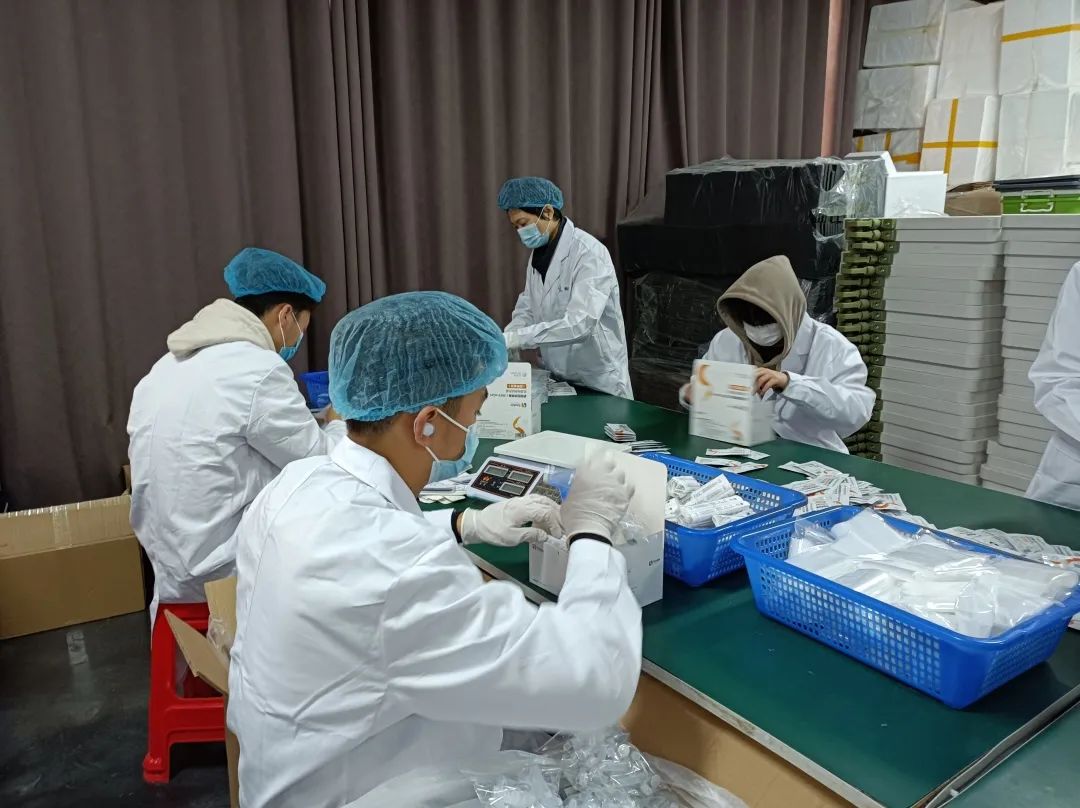 包装车间内,工人们熟练地将25个封口装袋的抗原检测试剂卡与一次性采样拭子、样本提取液、说明书、10孔支架、危废袋、合格证等装入包装盒,经称重检查后密封装箱,运送到二楼仓库准备发往各大药店。