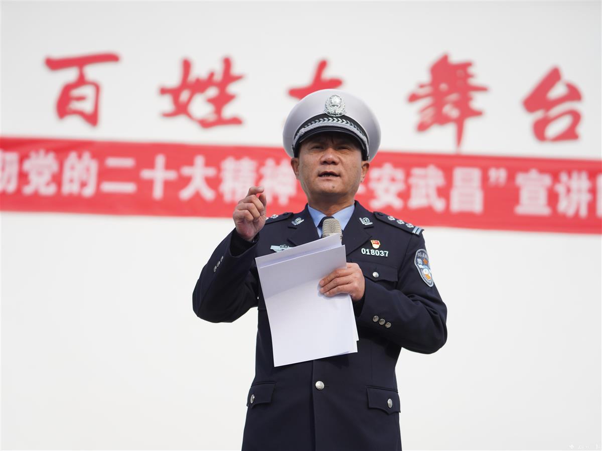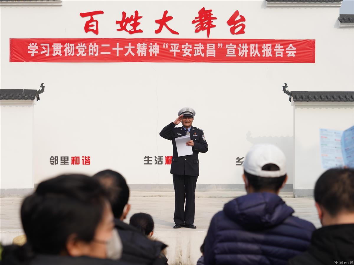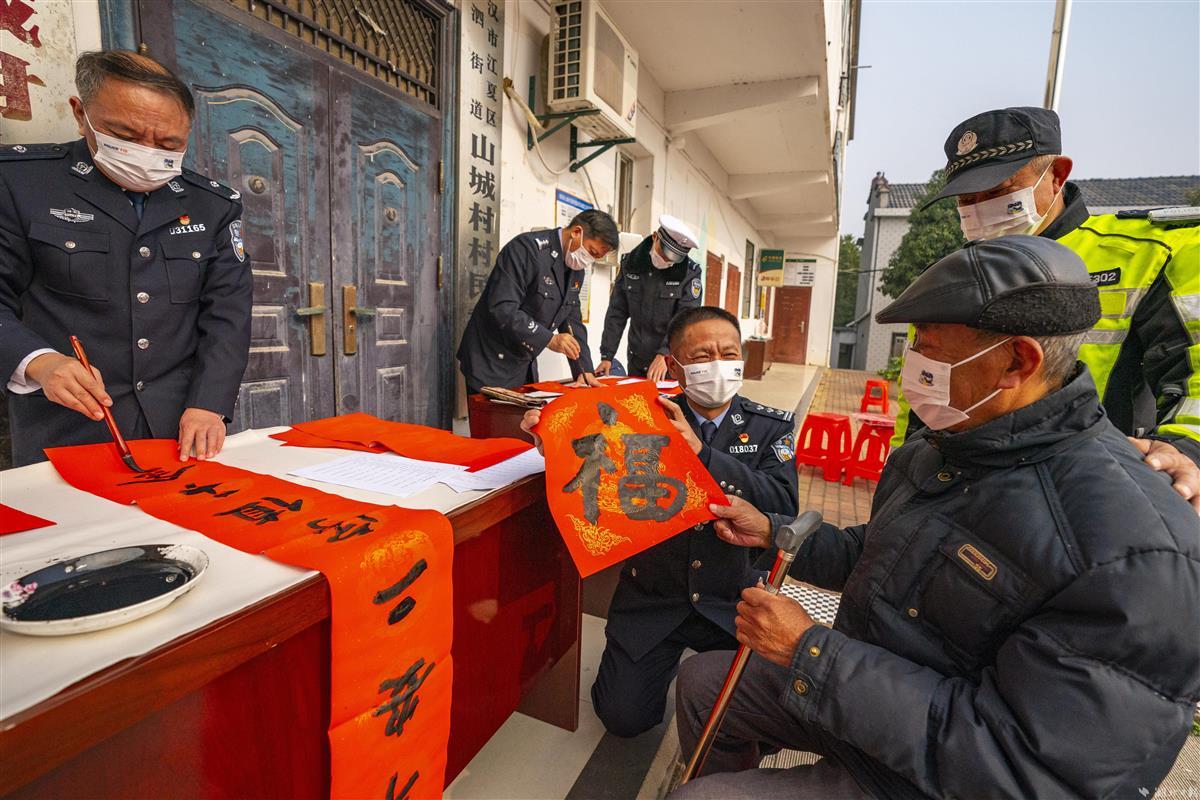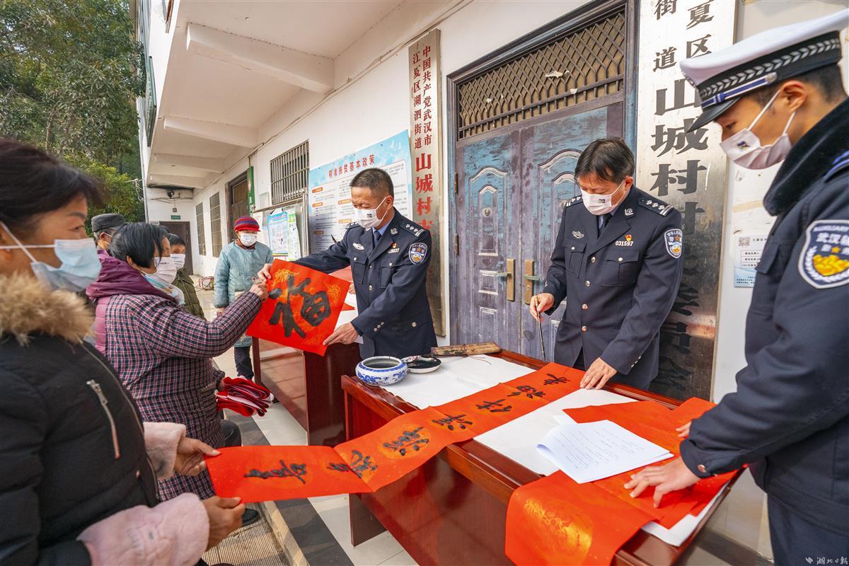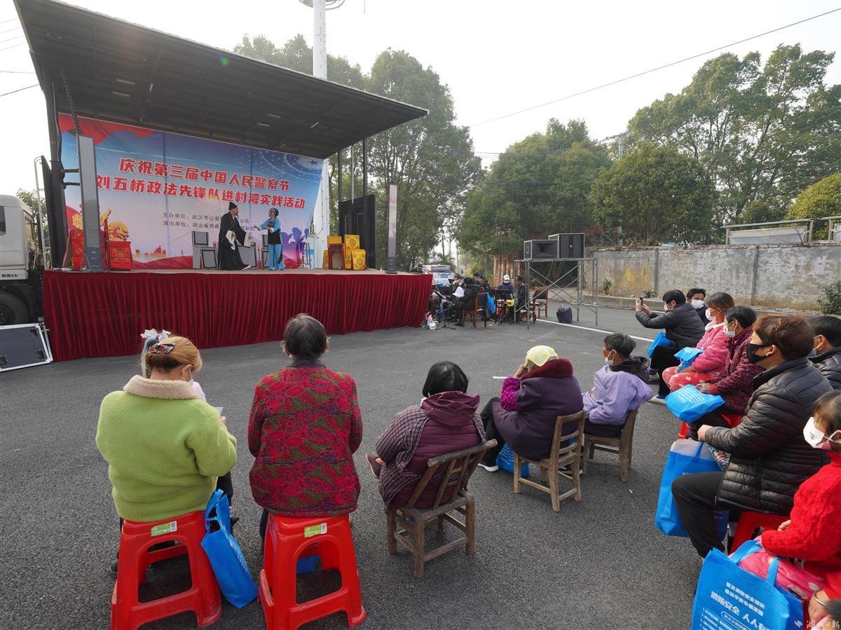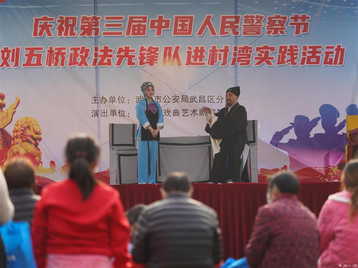 1月10日,武汉市公安局武昌区分局刘五桥政法先锋队来到江夏区湖泗街山城村,为村民宣讲党的二十大精神、送春联、演楚剧,与村民欢聚一堂、同迎新春。当天是第三个人民警察节,政法先锋队还为村民上了一节生动形象的“反诈防骗”课,帮助大家守护好自己的“钱袋子”。活动现场,警营书法家现场给村民书赠春联。政法先锋队还联合湖北省戏曲艺术剧院的专业演出队伍,将经典的楚剧搬到老百姓家门口,丰富村民的文化生活。