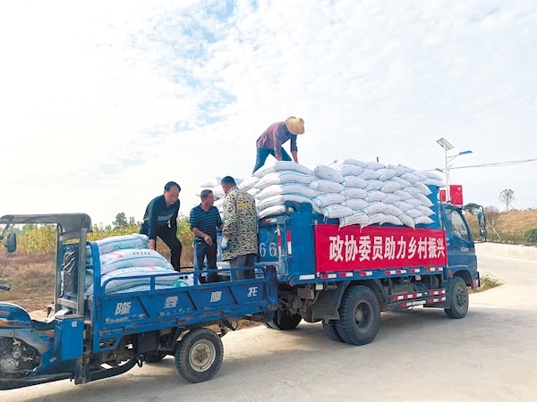 浠水县“政协委员助力乡村振兴行动”小组成员到洗马镇河东村为村民赠送30吨有机复合肥。