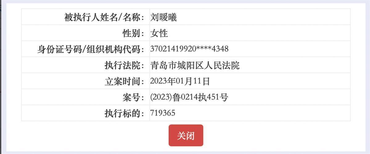 据中国执行信息公开网显示,刘暖曦(原名刘鑫)已成被执行人,执行标的71.94万元,立案时间为1月11日,执行法院为青岛市城阳区人民法院。