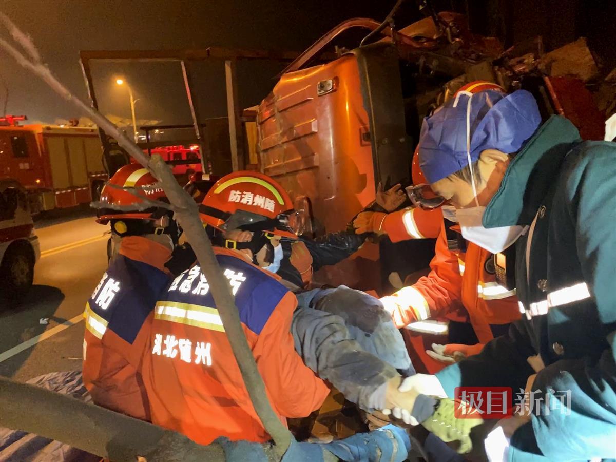 1月9日晚8时许,湖北省随州市高铁南站往向阳小区方向路口处发生车祸,一货车在与小轿车发生会车时,因操作失误导致车辆侧翻,造成2人被困车内无法自救。接到报警后,高新区红旗路消防救援站立即派出2车12人前往现场进行救援。