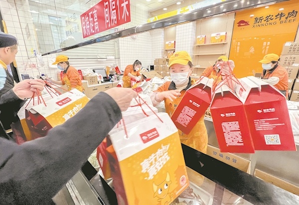 旗舰店里突然出现一辆推车,装满新农牛肉的礼盒在车上堆成了一座小山,正当在场的人们以为是补货车时,詹女士和她的帮手在众人瞩目下推走了这辆推车。詹女士告诉记者,公司专程派她从光谷前来,采购了四五十份新农牛肉礼盒,将作为春节福利发给公司员工,每个礼盒价值约400元。