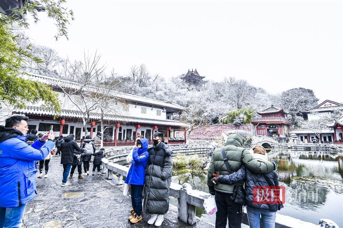 一夜风雪,1月15日上午,不少市民游客登上天下第一楼——黄鹤楼,看银装素裹的武汉三镇。
