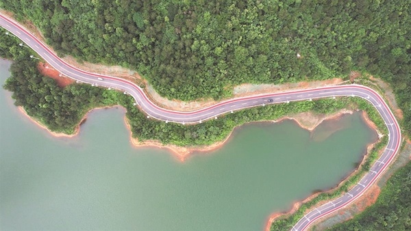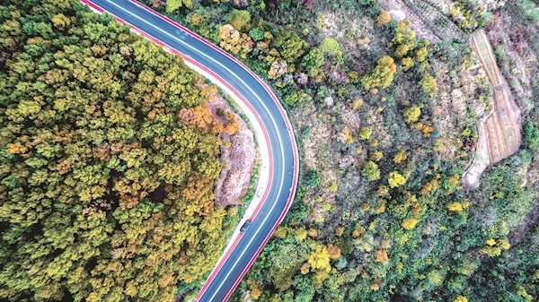 黑色的道路、彩色的标线,如一条条丝带缠绕在山间,与远的青山、近的村落融为一体。