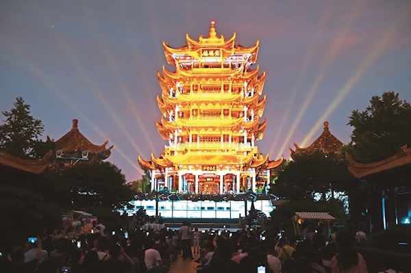 2020年,武汉市推出黄鹤楼公园的首个夜游项目“夜上黄鹤楼”,为武汉市民乃至全国游客带来城市夜游的全新体验,开演即成爆款。以黄鹤楼公园为载体,融合光影技术与艺术创作,串联起黄鹤楼主楼体、崔颢题诗壁、诗碑廊、鹅池等经典景点,展现武汉历史和黄鹤文化。