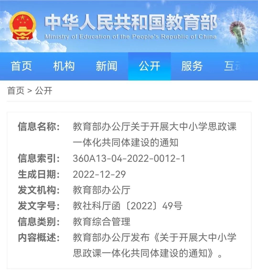 《关于开展大中小学思政课一体化共同体建设的通知》
