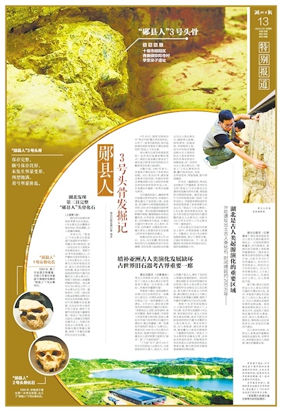 2022年9月29日的“‘郧县人’3号头骨发掘记”版面,也很好地发挥了图片的作用。全版通过一张发掘现场大图,和一张未完全出土的“郧县人”头骨化石图片来整合整个版面,用图片引出关键数据信息,表达版面创意。