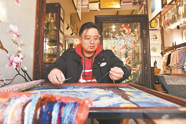昙华林,汉绣传人彭飞在绣制《星空图》