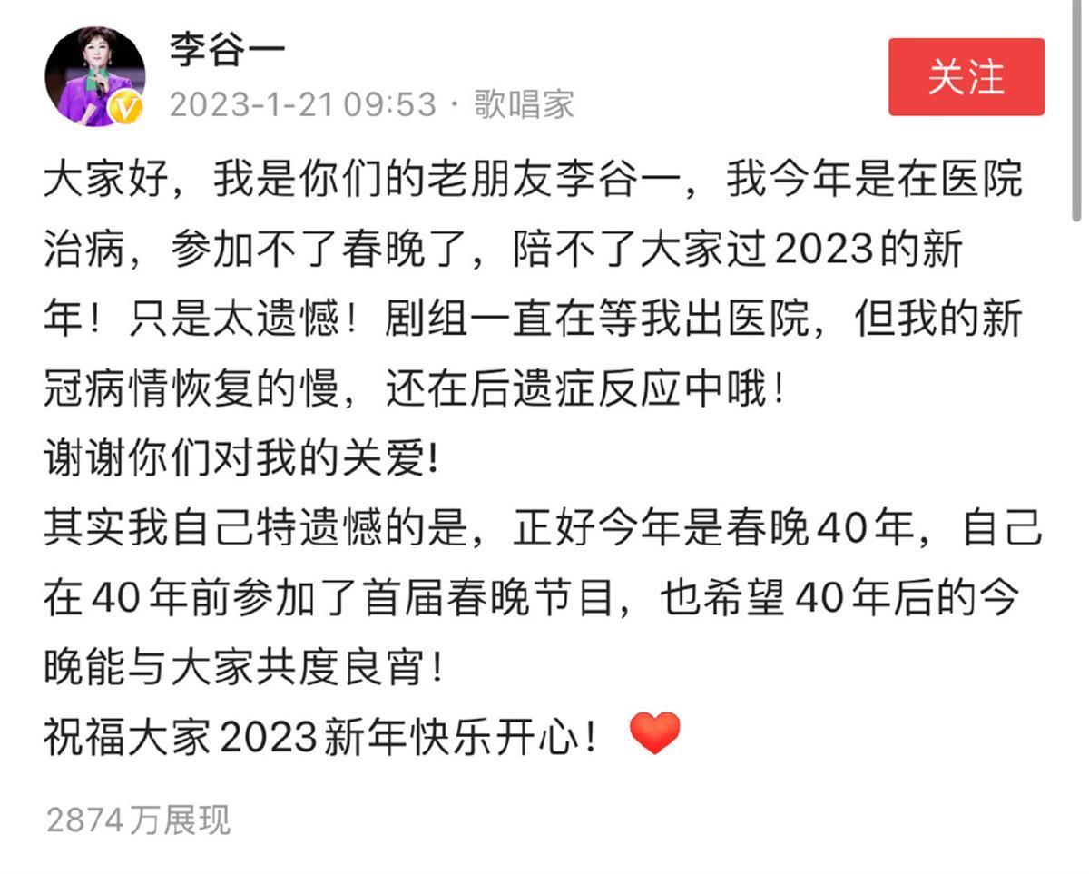而1月21日除夕当天,李谷一也在其个人社交媒体上发文表示:“我今年是在医院治病,参加不了春晚了,陪不了大家过2023年的新年!只是太遗憾!”