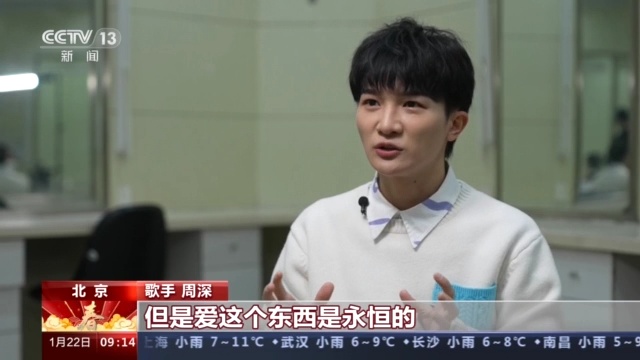 歌手 周深:有一次我在车上跟我的工作人员说,真的没有想到《花开忘忧》居然有一天能够上春晚,这是我到现在都还没有去适应的一个惊喜,我觉得非常非常的荣幸,可以在这么大的舞台,全国最大的舞台,也是全国温馨温情最浓厚的时刻去表达这一份爱。