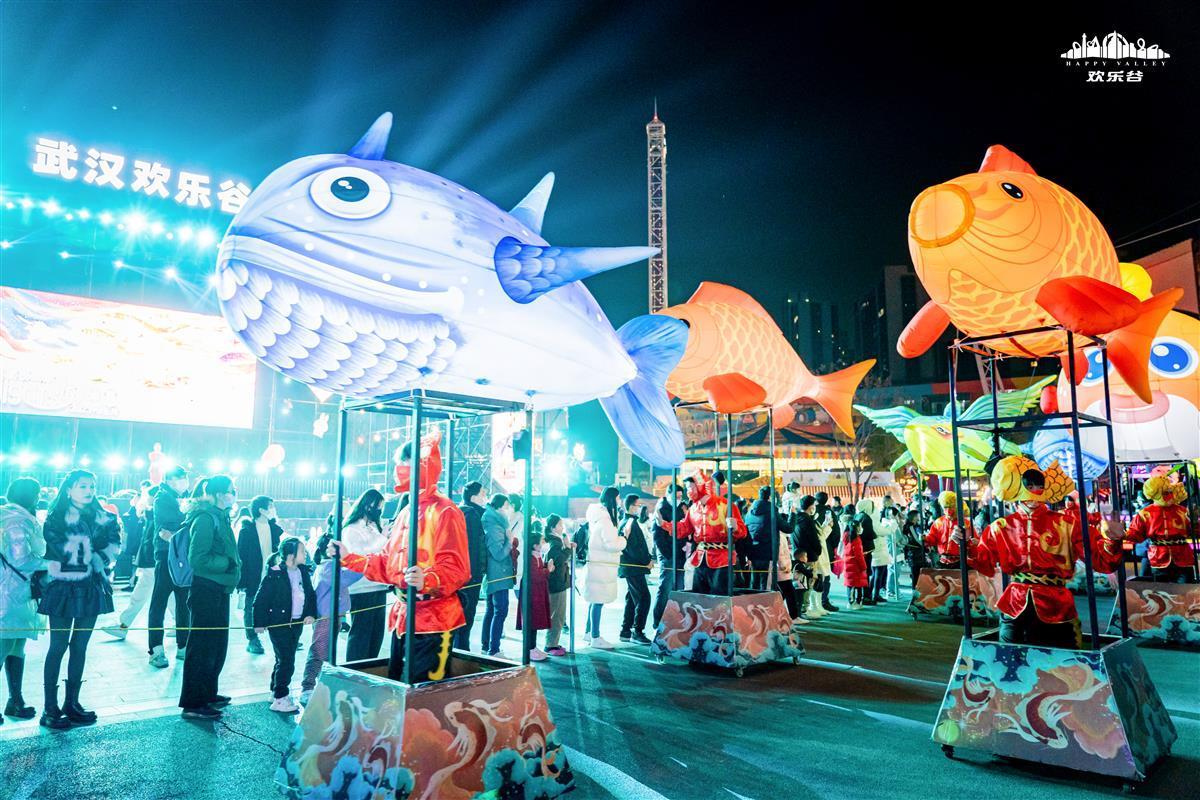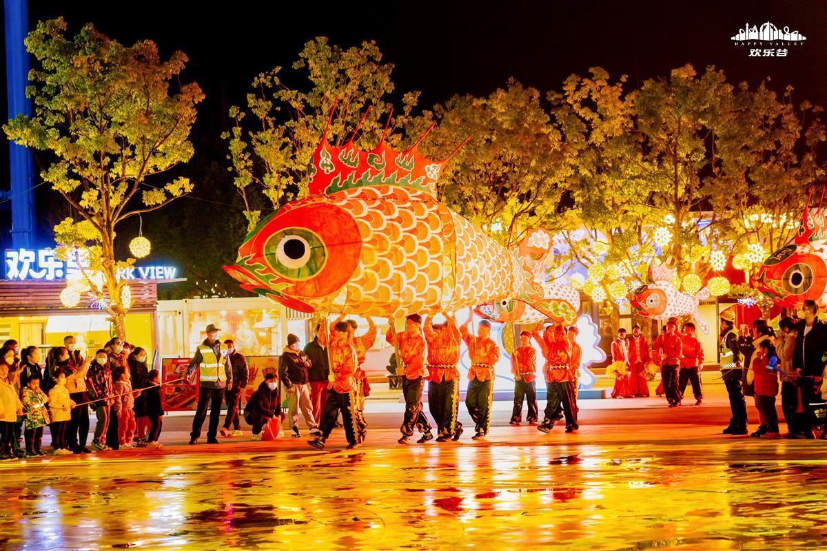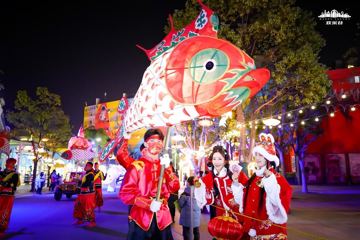 春节期间,欢乐谷送上精彩纷呈的演艺节目。徽州传统“汪满田鱼灯”营造了满满的年俗氛围感,7米长的特大鱼灯明亮灿烂映着人们的笑脸;新春国潮大巡游日夜场各具特色,日场民俗演艺闹新春,财神送福喜笑颜开,活力舞蹈青春动感;夜场锦鲤花车出动,海洋生物奇幻巡游。还有“幽默滑稽秀”“街舞扣篮秀”等快闪表演近距离互动,沉浸式陪游客欢乐过年。水舞台还举行“YU你有约Happy秀”新春限定晚会,炫彩光影科幻感十足,欢乐歌舞让现场瞬间沸腾。