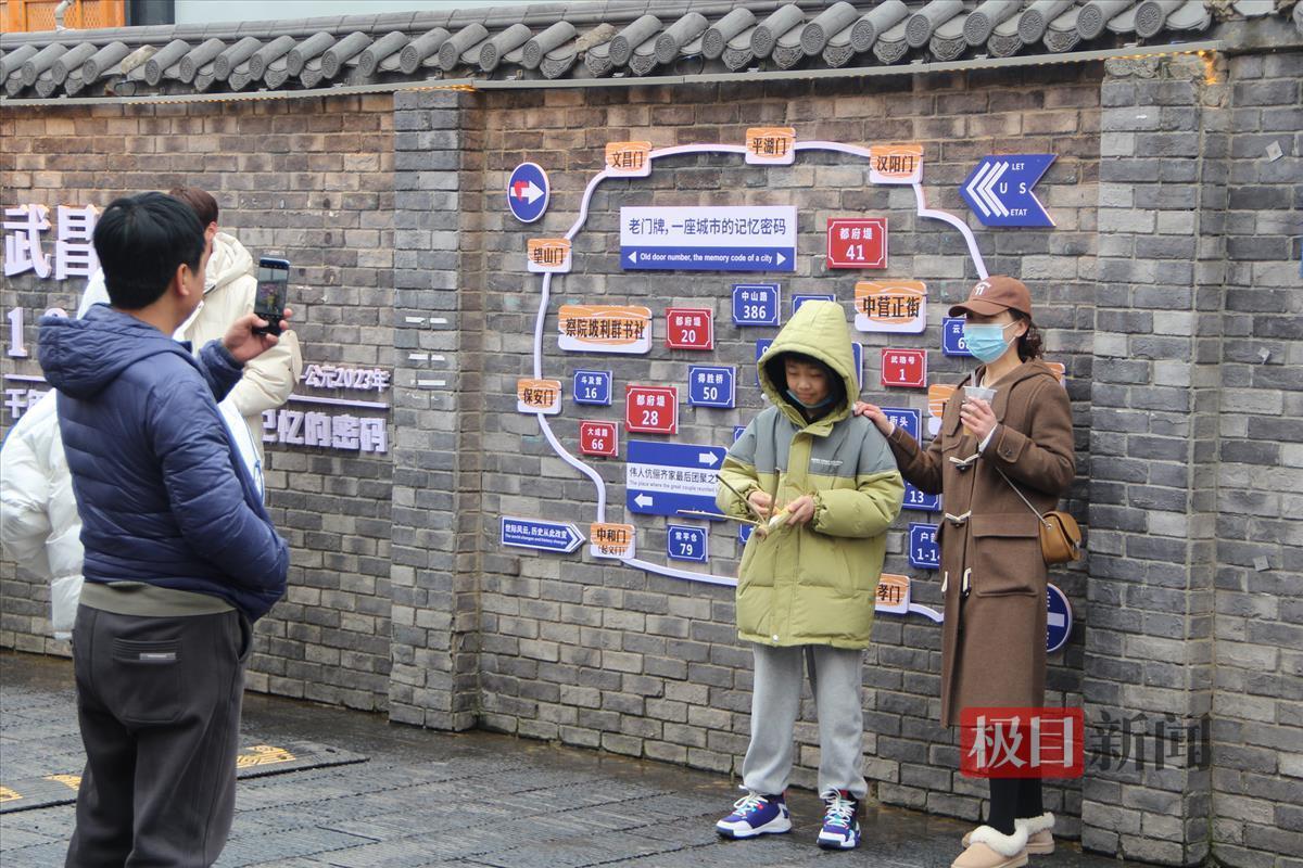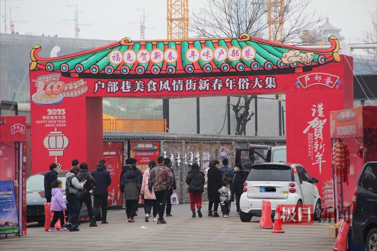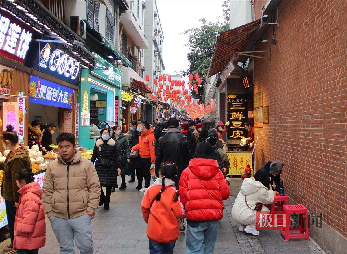 1月23日大年初二,极目新闻记者刚走上民主路天桥,写着“户部巷美食风情街·新春年俗大集”的红色大门就映入眼帘。透过大门向前望去,巷子里的游客熙熙攘攘,路边的美食正冒着热腾腾的蒸汽,一旁红彤彤的灯笼挂在古朴的房屋上,整条巷道一派欢乐喜庆的新春氛围。