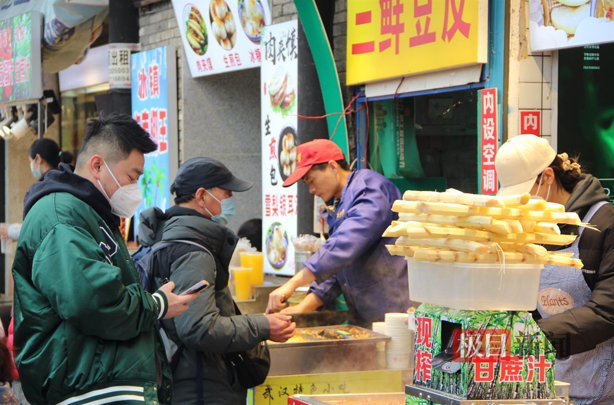 在街道的右侧,一家家美食小吃店鳞次栉比,既有豆皮、热干面等传统汉味小吃,也有铁板烤鱿鱼、拇指生煎等“网红美食”,如果渴了,鲜榨甘蔗汁、水果捞等饮品也应接不暇,令人犯起了选择困难症。