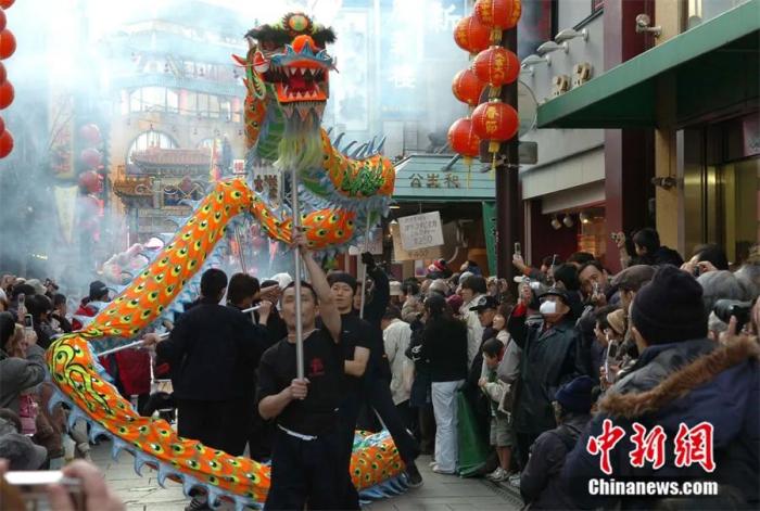 日本横滨的华侨华人社团以舞龙舞狮的方式欢庆中国传统的春节。滕剑峰 摄