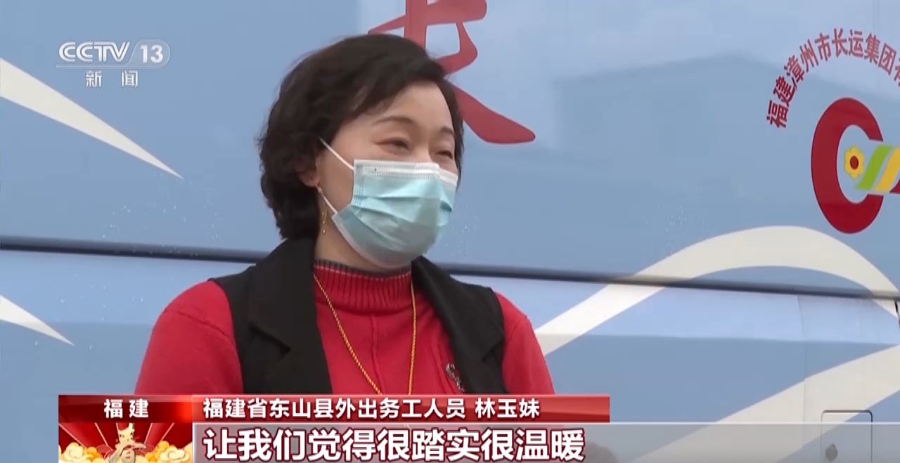 福建省东山县外出务工人员 林玉妹:点对点包车更方便,而且我们还收到了健康防疫包,里面的东西都很实用。医务人员给我们讲了防疫常识,让我们感到很踏实,很温暖。