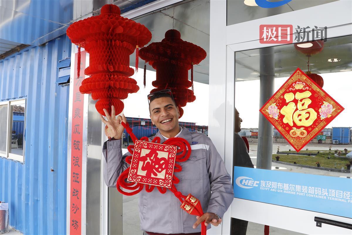 在埃及亚历山大省,阿布基尔集装箱码头项目部员工很早就开始为盛大隆重的春节做好准备,挂红灯笼,张贴对联。
