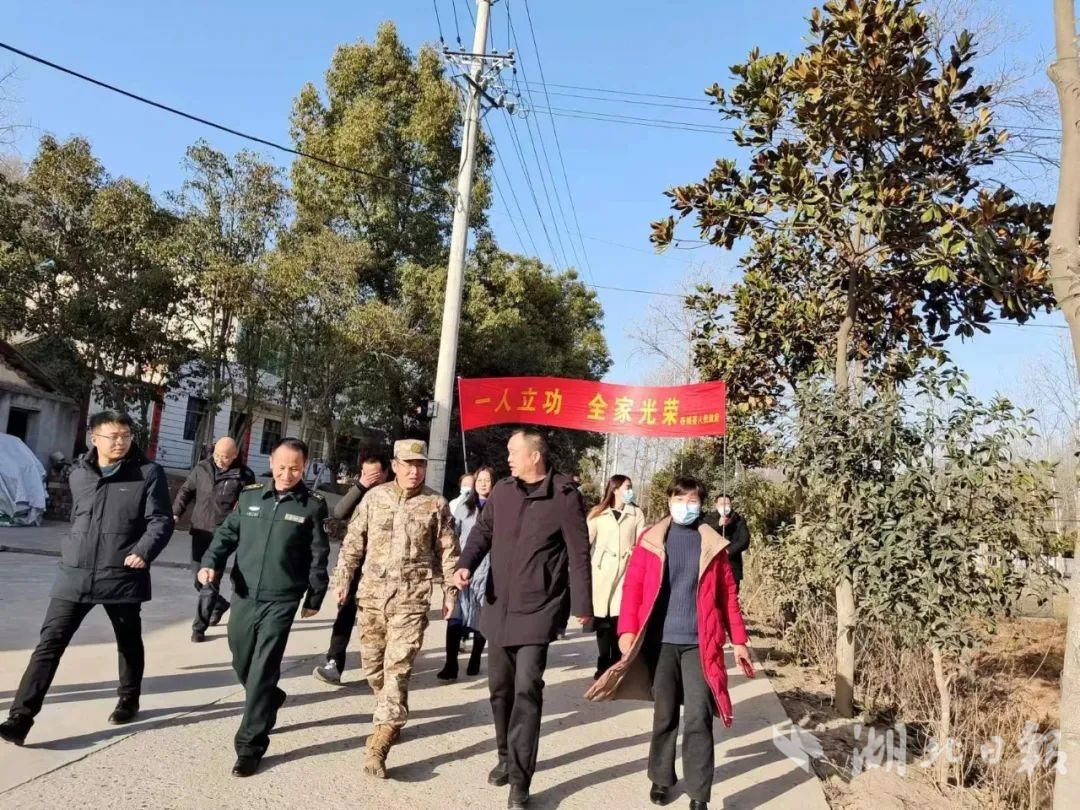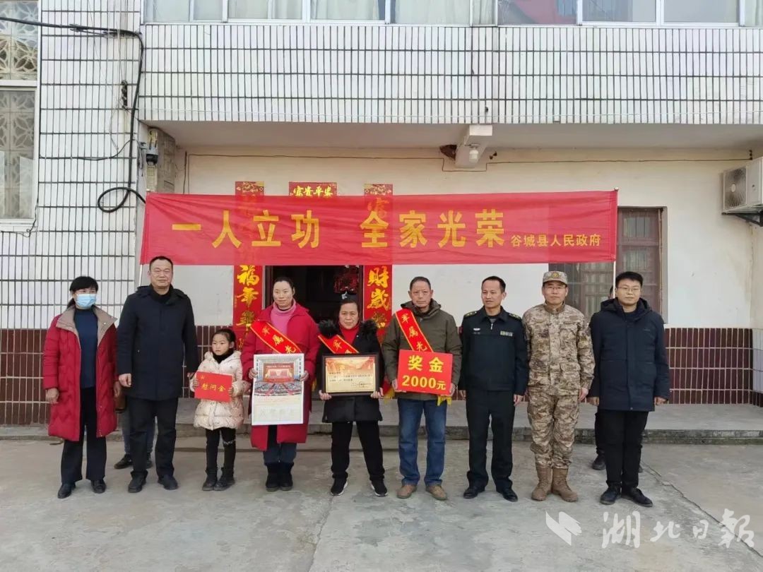 湖北日报客户端讯(通讯员 姚静 邹雷)1月28日下午,谷城县石花镇大峪村2组葛秀辉家门前锣鼓阵阵,热闹非凡。火箭军某部队联合县人武部、县退役军人事务局、石花镇政府工作人员一行,把三等功喜报送到了现役军人葛秀辉的家中,让他和家属共同感受到了这份喜悦和荣光。