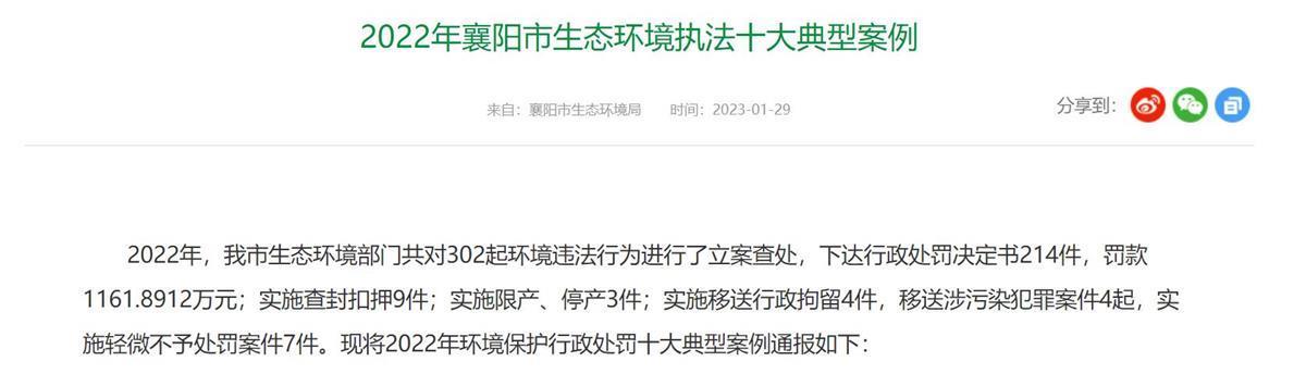 近日,湖北省襄阳市生态环保局发布2022年度十大生态环境执法案例。据了解,2022年襄阳生态环境部门共对302起环境违法行为进行了立案查处,下达行政处罚决定书214件,罚款1161.8912万元。其中实施查封扣押9件,实施限产、停产3件,实施移送行政拘留4件,移送涉污染犯罪案件4起,实施轻微不予处罚案件7件。