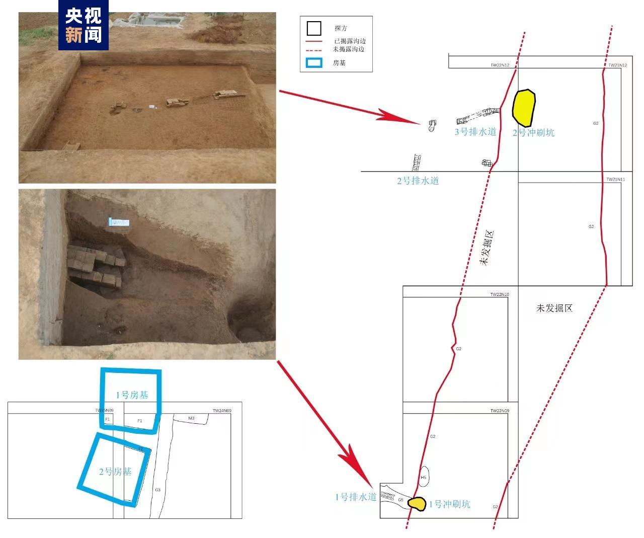 勘探发现的南北向沟状遗迹经发掘证实为一条排水沟。探明全长160米,发掘区域覆盖中部约40米长度。沟的东西两壁内斜,底部为弧底,宽7—9米,深度2.1—3.8米。沟内底部有明显的淤积土,上部堆积可分为三层,包含大量瓷片等遗物。说明此沟最初应当是作为排水沟使用,废弃后被生活垃圾逐渐填埋。