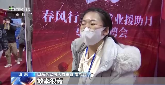 山东某公司人力主管 贾雅琦:人流量也很大,对我们企业来说也方便了很多。现在是一个多小时,有30多个人,这种情况一般是一两分钟能谈一个,效率很高。