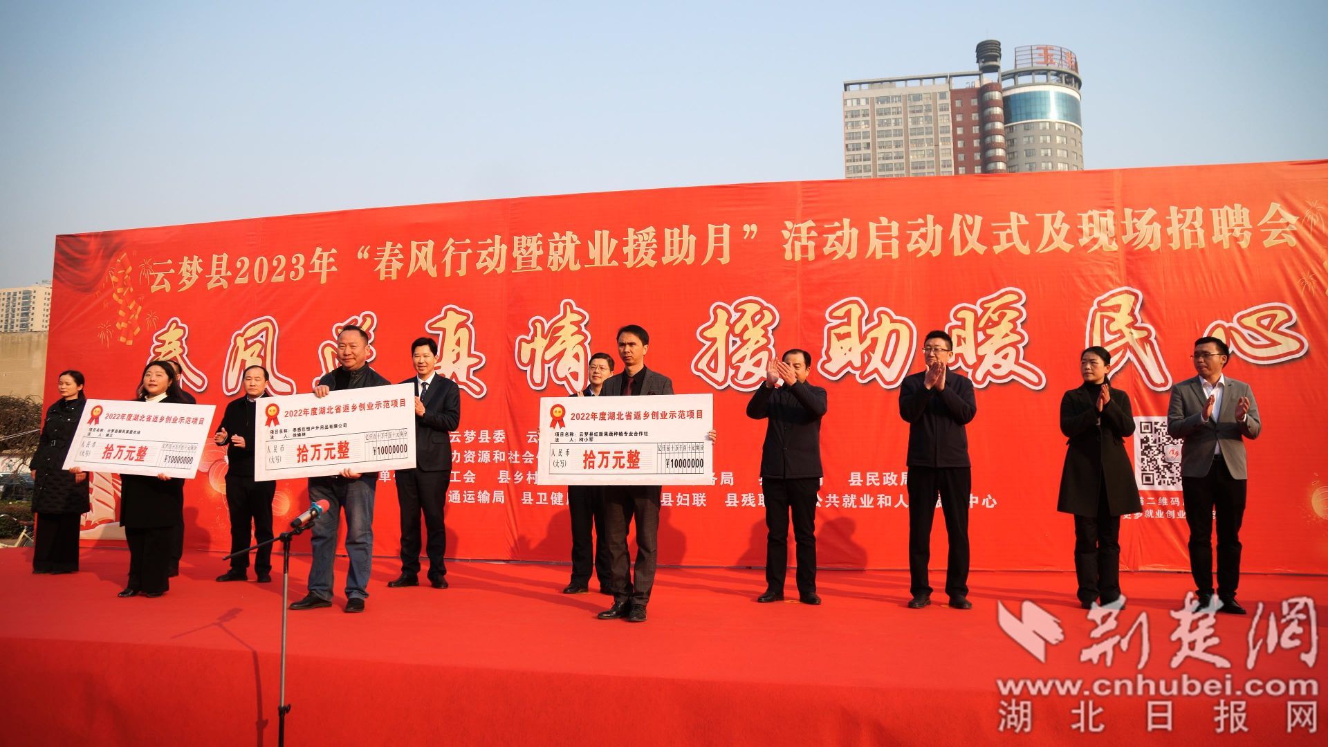 荆楚网(湖北日报网)讯(记者李传维、周洪阳 通讯员程爱华、谭倩)1月30日,云梦县2023年“春风行动暨就业援助月”活动启动仪式及现场招聘会在云梦县人民政府广场举行,100家企业为求职者提供6000余个岗位。县委书记高文峰,县委副书记、县长方超为2022年度湖北省返乡创业示范项目单位颁奖。