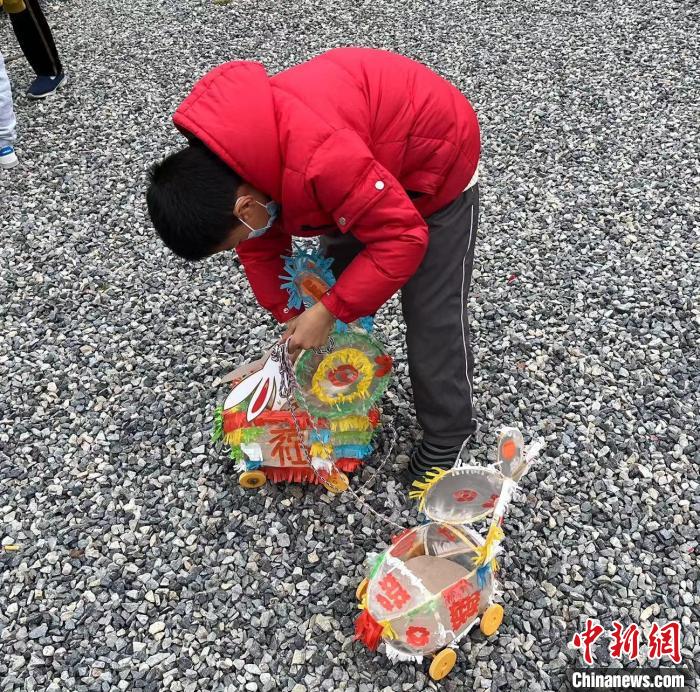 上海市浦东新区群众文化艺术馆的文化广场中,一个孩子在玩可以拖动的兔子灯 谢梦圆 摄