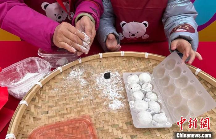 68岁的奶奶带着9岁的孙女媛媛报名了包汤圆的活动,摆在祖孙两人面前的有两样原料——白生生的糯米粉团和黑黝黝的猪油芝麻馅儿。这是媛媛人生中第一次自己动手包汤圆,有些手足无措,不过身边的奶奶显然是个包汤圆的老手,只见她熟练地揪下一小团糯米粉,用拇指按成窝窝头的形状,加入适量芝麻馅儿,再补些粉、包上“窝窝头”,最后在掌心搓几下,一颗圆溜溜的汤圆就成了!奶奶一边告诉记者一边指导孙女包汤圆:“我从小到大每年过元宵节都要吃汤圆的,而且都是自己做。现在也想带孙女来感受一下。”