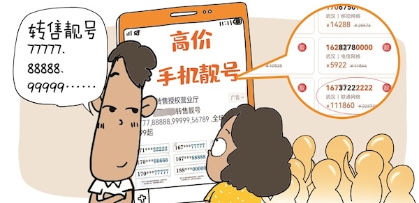 彰显身份地位、奇货可居升值空间大、特殊礼物暖心精致……今年春节,不少人的微信朋友圈里都收到了这样的手机靓号销售广告。这些手机靓号多是连号或有规律的数字组合及带有“6”“8”等数字的号码,最低几百元,其中六个“2”连号的靓号要价甚至超过11万元。