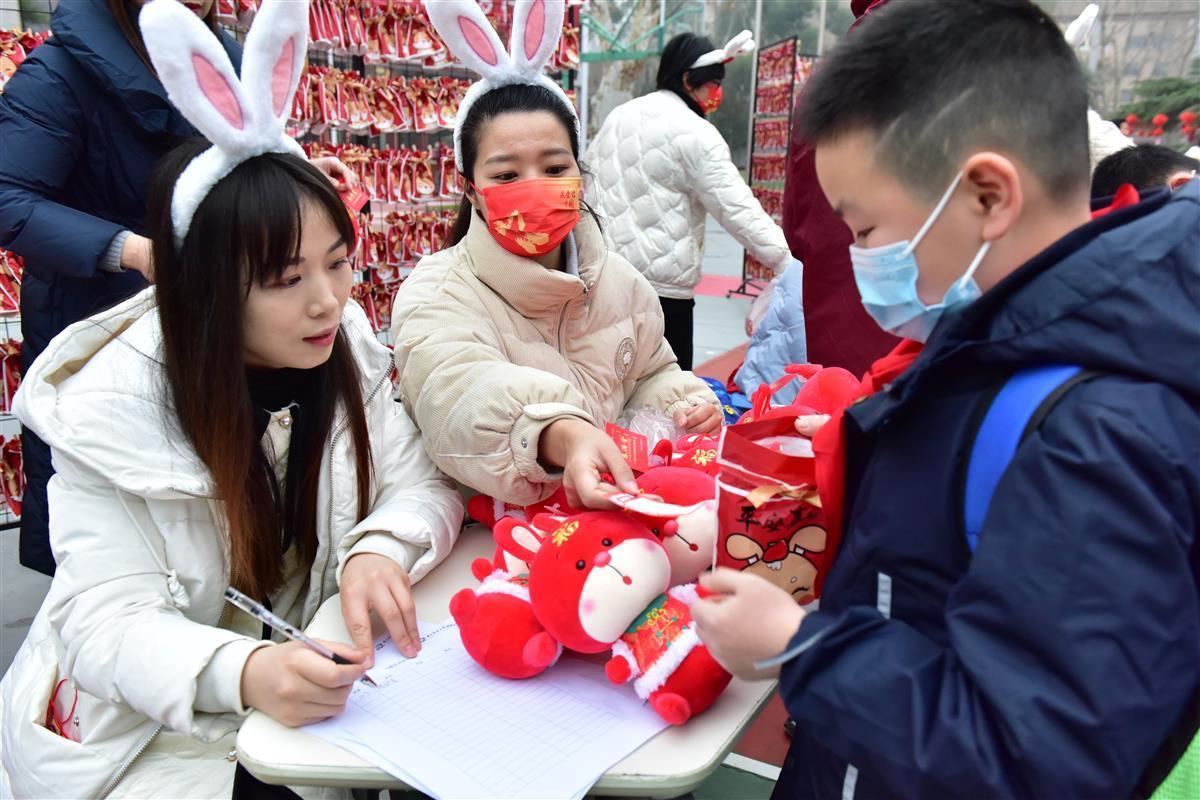 一大早,老师们在校园门口携小兔子人偶,热情欢迎返校的同学,迎接他们的还有学校精心准备的新学期福袋——幸运书签及惊喜大奖。