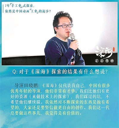 《大圣归来》豆瓣8.3分,《深海》7.3分,一分之差,让田晓鹏听到了不少批评的声音,对此田晓鹏坦承《深海》是他一次冒险,这是他一次非常个人化的创作,“我愿意承担这次冒险的代价”。