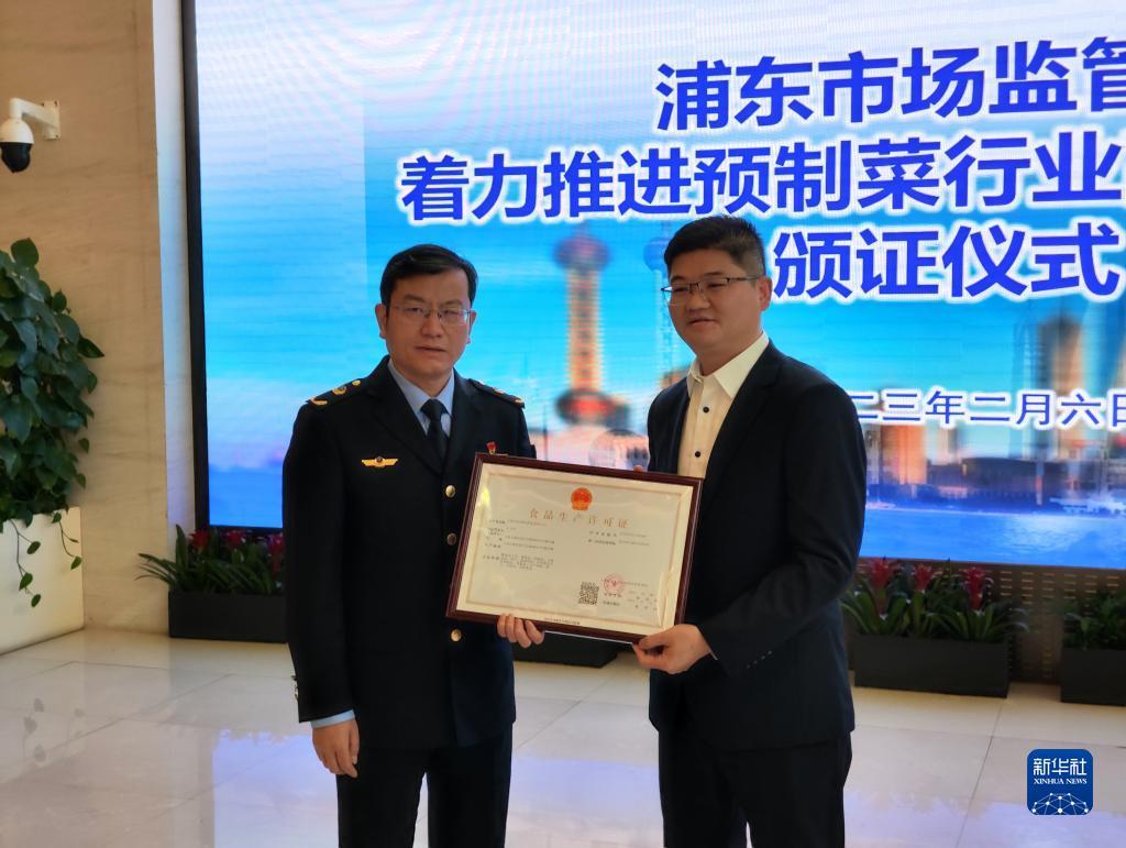 新华社上海2月6日电(记者杨有宗)6日,在上海市浦东新区企业服务中心,浦东新区市场监督管理局为企业颁发了上海市首张包含预制菜的食品生产许可证。这在规范、便利预制菜企业生产经营,提升预制菜新品落地速度的同时,也将加速行业规范化进程,助推行业高质量发展。