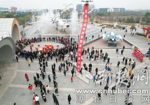 “极客公园祝游客朋友们元宵节快乐!”挂着祝福的无人机在静态飞机展示区的上空盘旋,甜甜的糖果从无人机洒下,吸引游客纷纷上前拾起甜蜜的祝福。