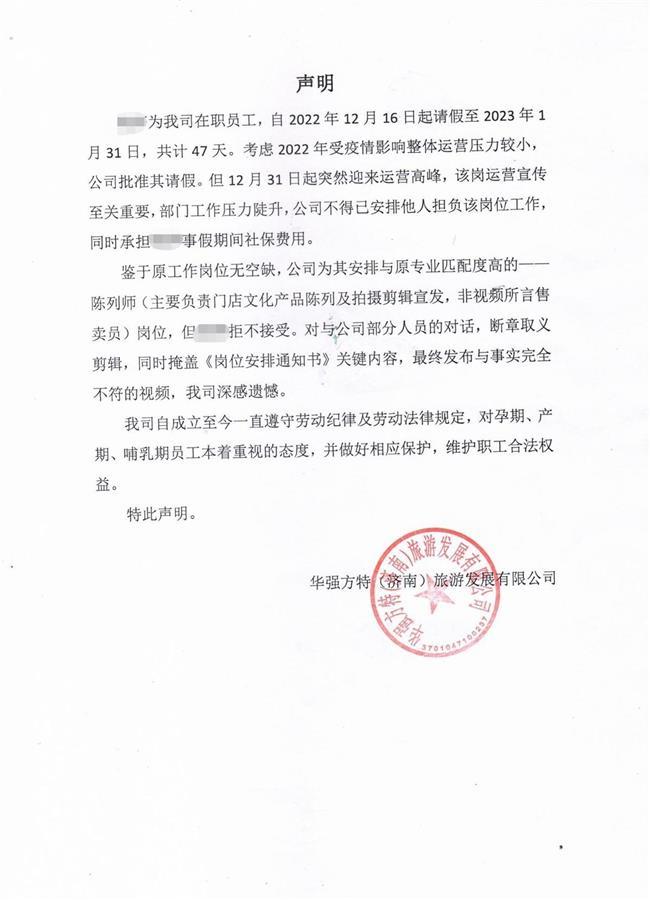 对此,济南方特的官方账号曾发布声明称,员工唐女士的事假共计47天,考虑2022年受疫情影响整体运营压力较小,公司批准其假期。但12月31日突然迎来运营高峰,该岗位宣传至关重要,公司不得已安排他人担负该岗位工作。鉴于原工作岗位无空缺,公司为其安排与原专业匹配度高的陈列师(主要负责门店文化产品陈列及拍摄剪辑宣发,非售卖员),但唐女士拒不接受。