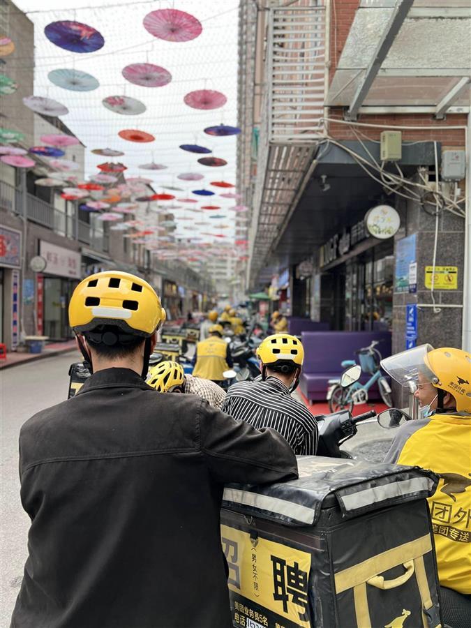 一个个快递小哥骑着摩托车在人流间轻轻地熟练地穿梭而过,骑术之高令人赞叹