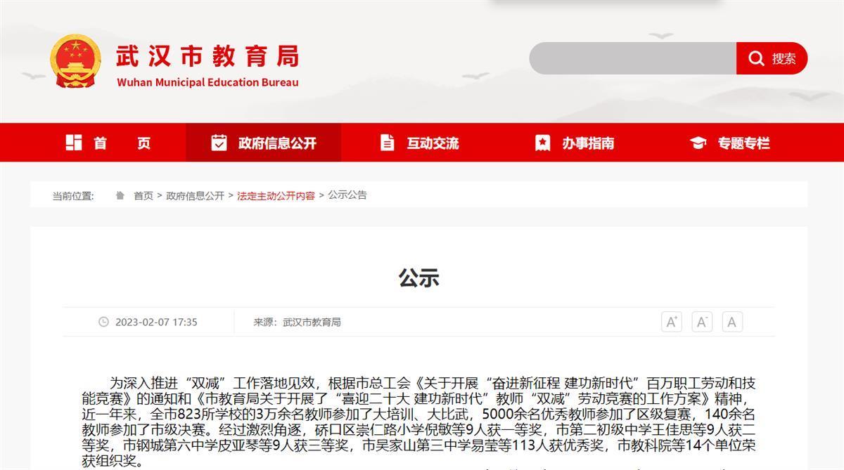2月7日,武汉市教育局官网发布一则公示:为深入推进“双减”工作落地见效,根据武汉市总工会《关于开展“奋进新征程 建功新时代”百万职工劳动和技能竞赛》的通知和《市教育局关于开展了“喜迎二十大 建功新时代”教师“双减”劳动竞赛的工作方案》精神,近一年来,全市823所学校的3万余名教师参加了大培训、大比武,5000余名优秀教师参加了区级复赛,140余名教师参加了市级决赛。