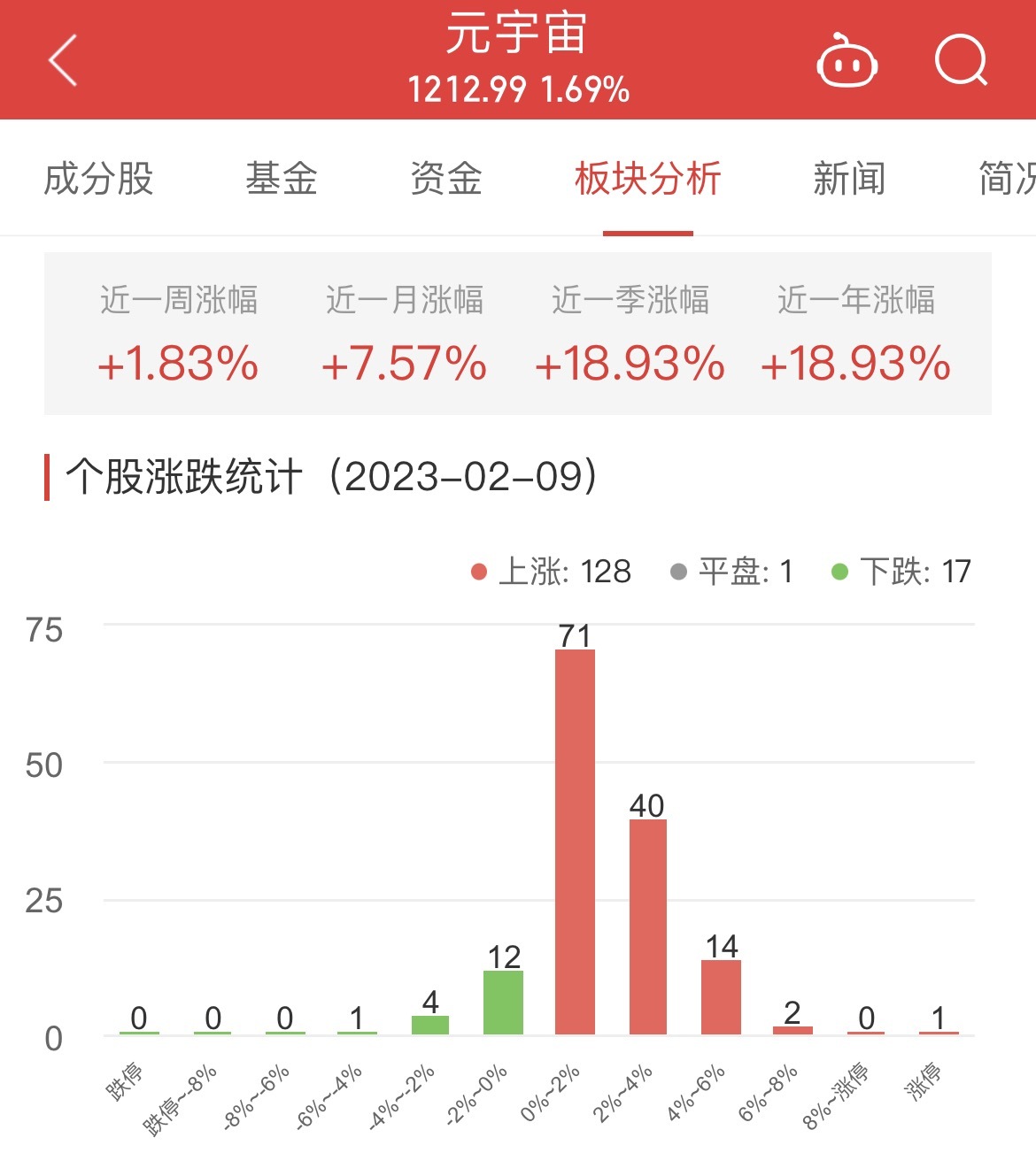 中国经济网北京2月9日讯 今日,元宇宙板块整体涨幅1.69%,其中128只股票上涨,1只股票平盘,17只股票下跌。