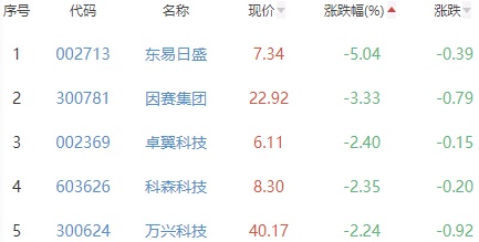 东易日盛、因赛集团、卓翼科技、科森科技和万兴科技位列涨幅榜后五位,涨幅分别为-5.04%、-3.33%、-2.40%、-2.35%和-2.24%。