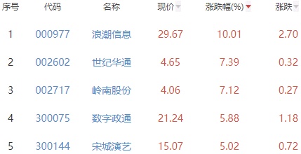 其中,浪潮信息、世纪华通、岭南股份、数字政通和宋城演艺位列板块涨幅前五位,涨幅分别为10.01%、7.39%、7.12%、5.88%和5.02%。