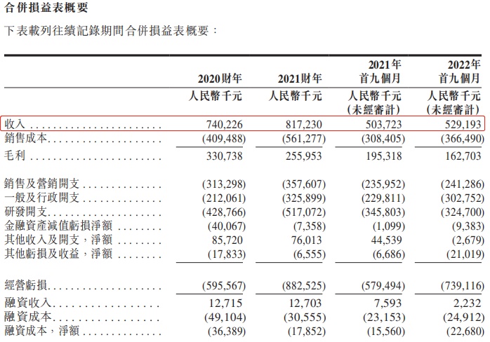 于往绩记录期间,优必选取得收入增长。于2020财年、2021财年及2022年首九个月,公司录得收入分别为人民币740.2百万元、人民币817.2百万元及人民币529.2百万元。