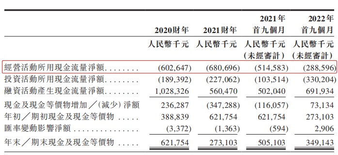 于往绩记录期间,公司的经营活动产生负现金流量,于2020财年、2021财年及2022年首九个月分别为人民币602.6百万元、人民币680.7百万元及人民币288.6百万元。