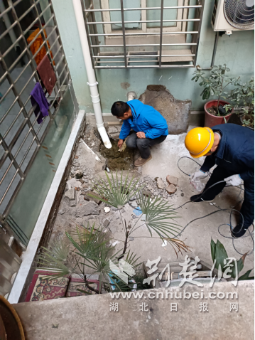 玉帝巷居民点属于散居居民点,无物业管理,没有房屋维修基金,社区也没有专项维修资金。接到该住户反映后,为了尽快解决管道堵塞的问题,社区专职工作人员曾小玲第一时间到现场了解情况。经邀请热心居民帮助查找原因,确定为埋在墙内的主管道破损,如果哪里堵了修哪里,后期其他楼层也会出现类似问题。