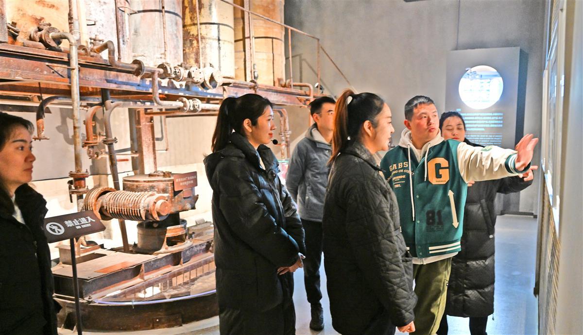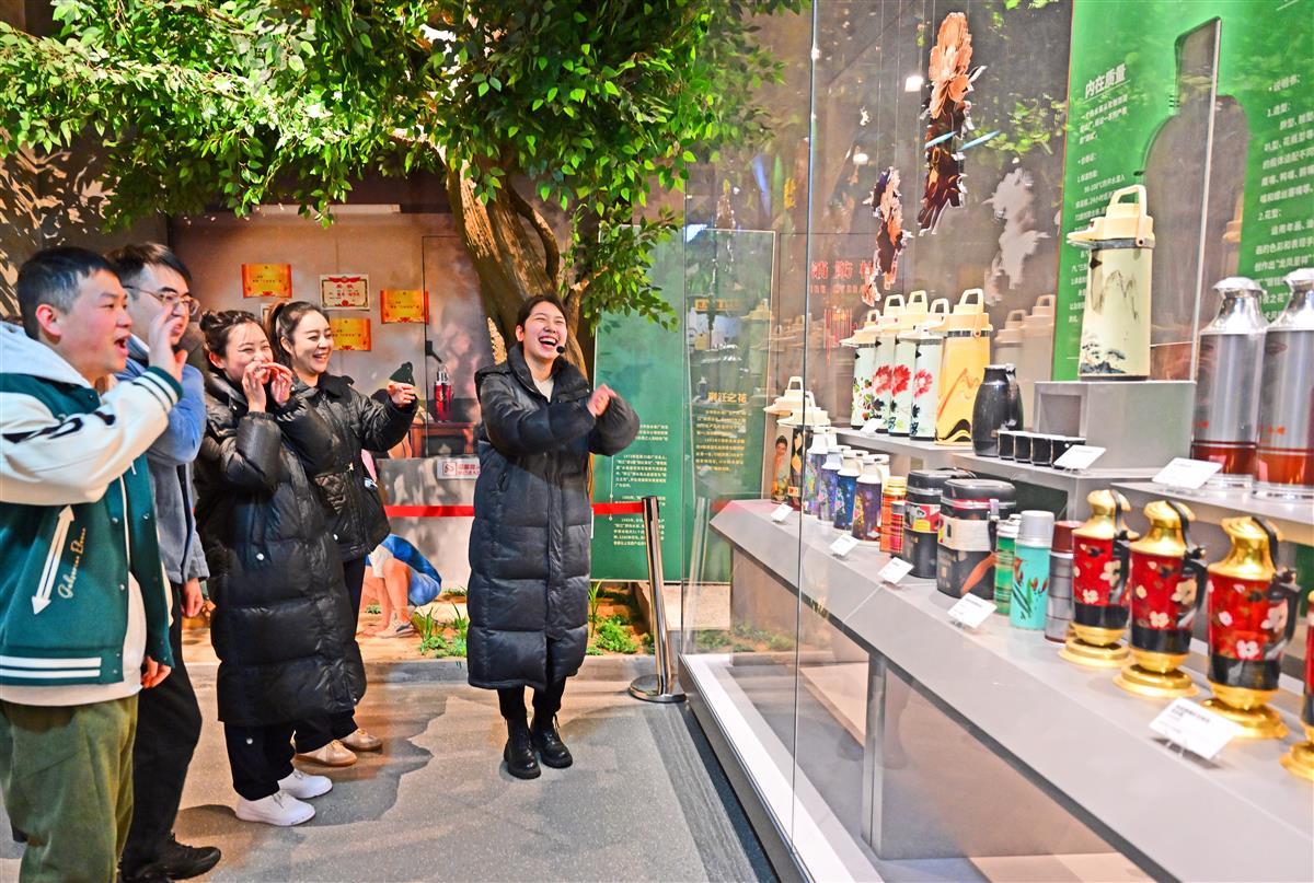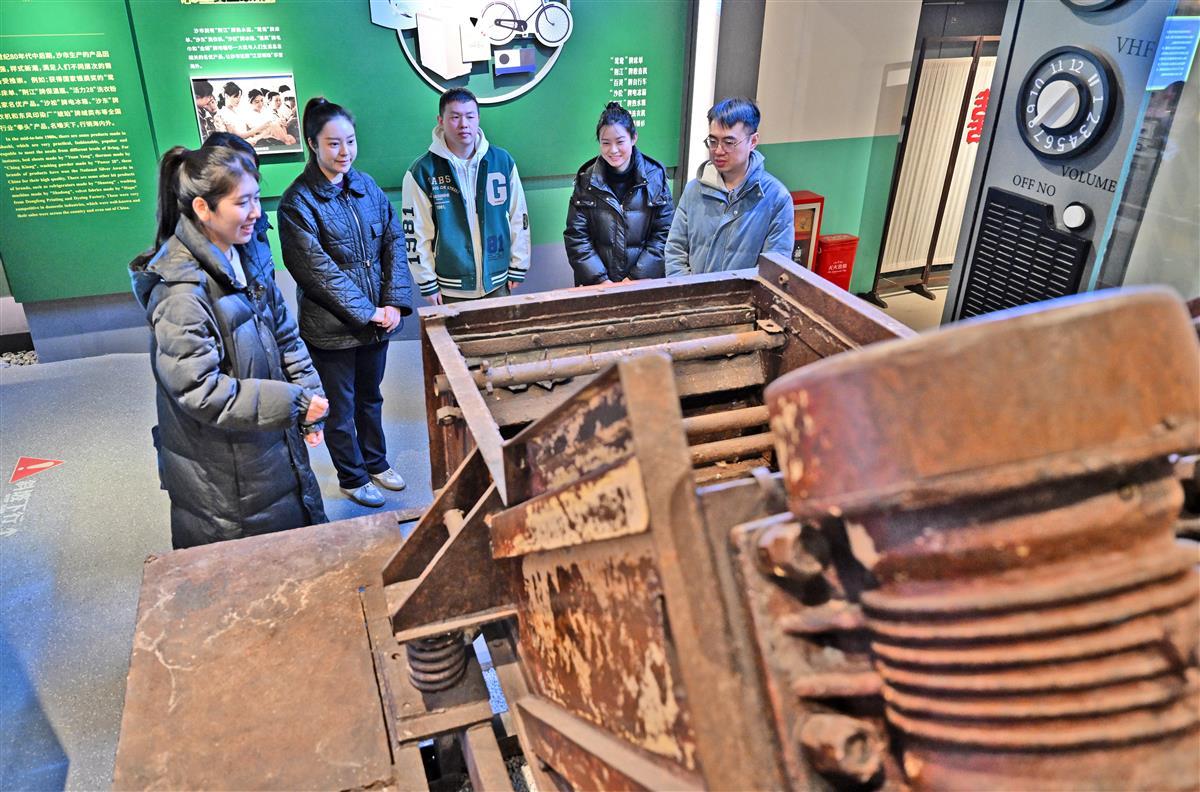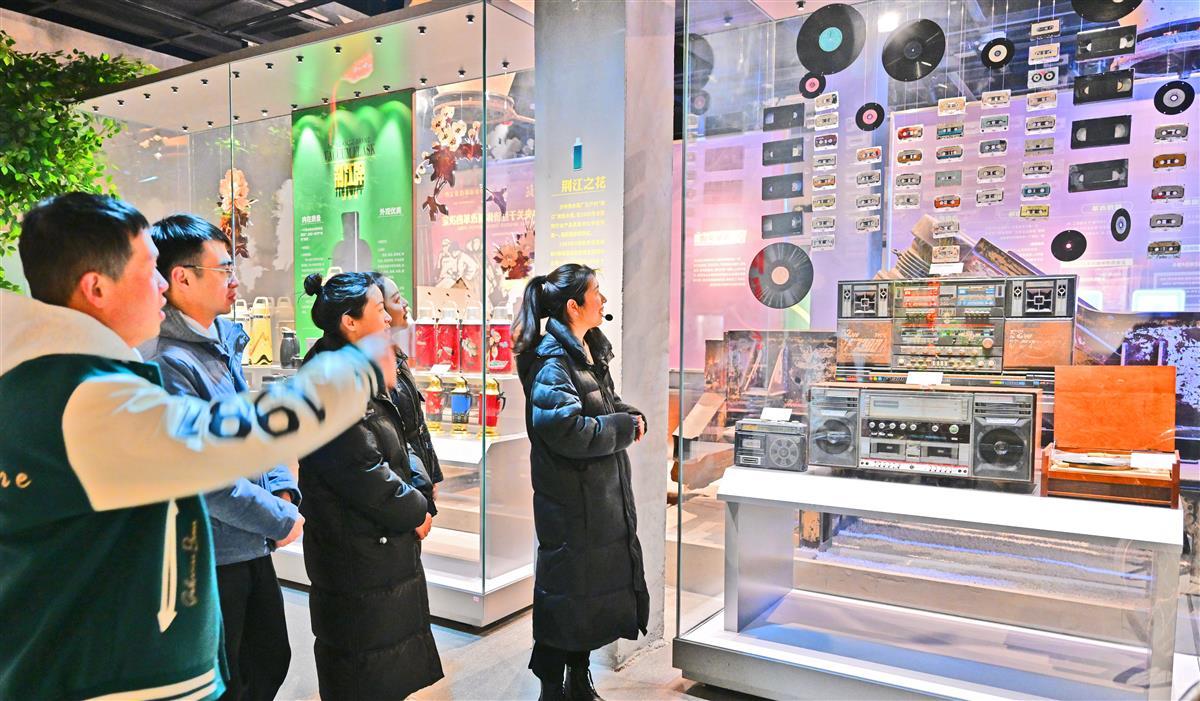 2月8日,游客在荆州新建成的沙市洋码头文创园参观,年轻的游客对江汉明珠展馆中沙市工业成就饶有兴趣。