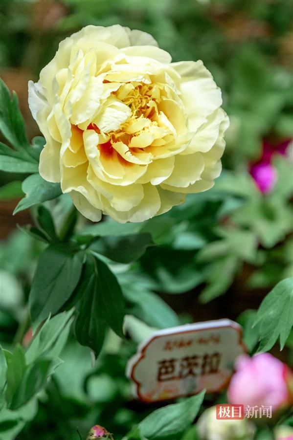 牡丹展厅,白、粉、红、紫、蓝、绿、黄等九色牡丹花团锦簇,1500株牡丹正值盛花期,40多个品种全部开放。最负盛名的黄牡丹“巴茨拉”拥有一半牡丹一半芍药的血统,是公认最美的伊藤杂种牡丹,具有极高的观赏价值和经济价值。它的叶子和茎似芍药,花型和香味似牡丹,花为橙黄色,蕊中心为翠绿色,还具备几分青柠檬香气。此外,近日还新增了正红色的“旭港”、白色的“白王狮子”等牡丹品种。