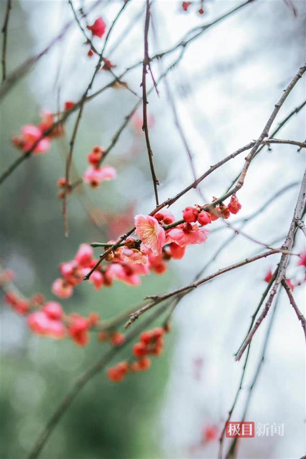 武汉植物园全园种植梅花80多株,主要分布在小梅园。这里既有果梅也有花梅,还有花果兼用的梅品种。果梅的花多单瓣,花梅的花型较多,有复瓣、重瓣、台阁型等。目前开放的梅花约三成,过一段时间,朱砂梅、垂枝梅也将接棒开放。晴日梅花分外妖娆,雨中赏梅也颇有意境。