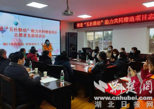 荆楚网(湖北日报网)讯(通讯员 朱惊荆)在省民政厅“支持五社联动 助力共同缔造”项目支持及市民政局指导下,为深入推进“五社联动”助力共同缔造项目,充分发挥社区社会组织参与基层治理的作用,2月10日上午,湖北省荆门市东宝区泉口街道金龙泉社区在启明星社工中心的协助下,组织开展了“五社联动”助力共同缔造项目志愿者见面暨培训会。