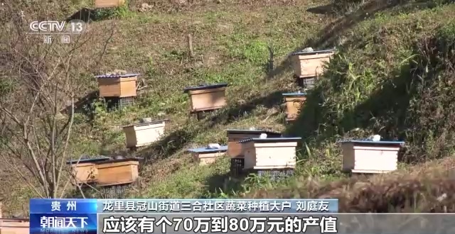龙里县冠山街道三合社区蔬菜种植大户 刘庭友:去年采收了6000多斤的蜂蜜,按照价值换算的话应该有70万—80万左右的产值,像土特产这块只要用心去做,把这个产品质量做好做扎实的话,还是比较挣钱的。