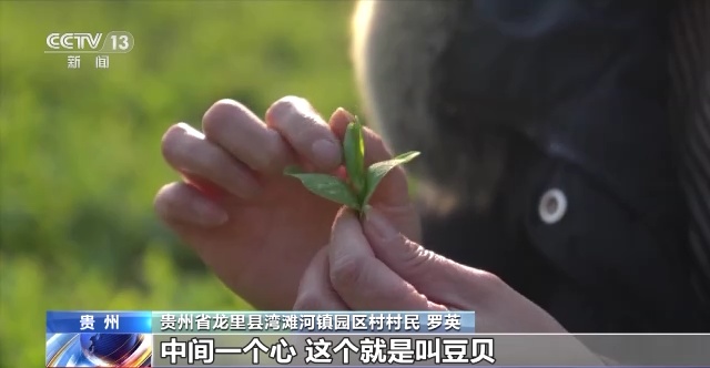 贵州省龙里县湾滩河镇园区村村民 罗英:采摘的方法分几种,你看这个就是两片叶子,中间一个心,这个就叫豆贝。