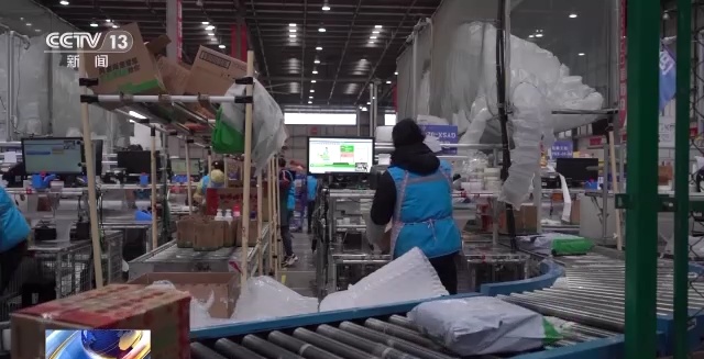 运输土特产的车辆在仓库间进进出出、货物在流水线上迅速打包、包裹在传送带上智能分拣,平均每天有400万票快递从这里进出。
