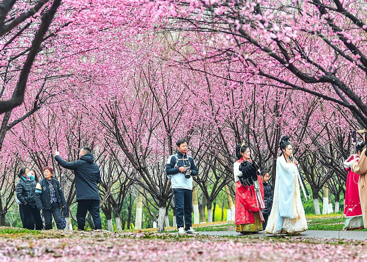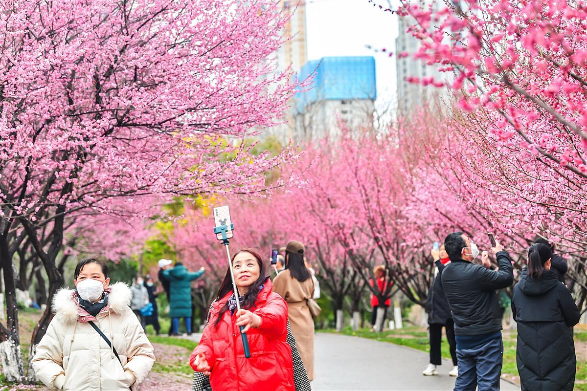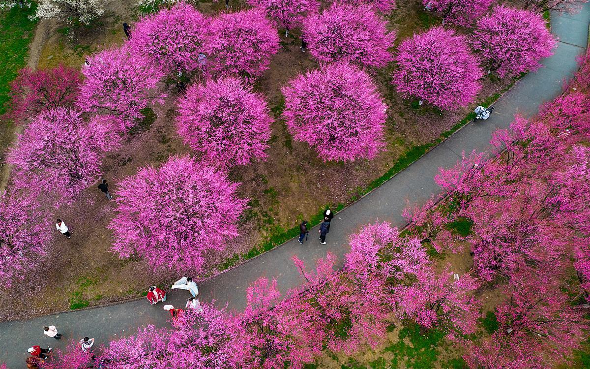 2月12日,武汉竹叶海公园内的山坡上,满坡错落有致的300余株梅花迎春绽放,穿梭在粉、白、红三色叠加的花海中,宛如置身童话世界中。