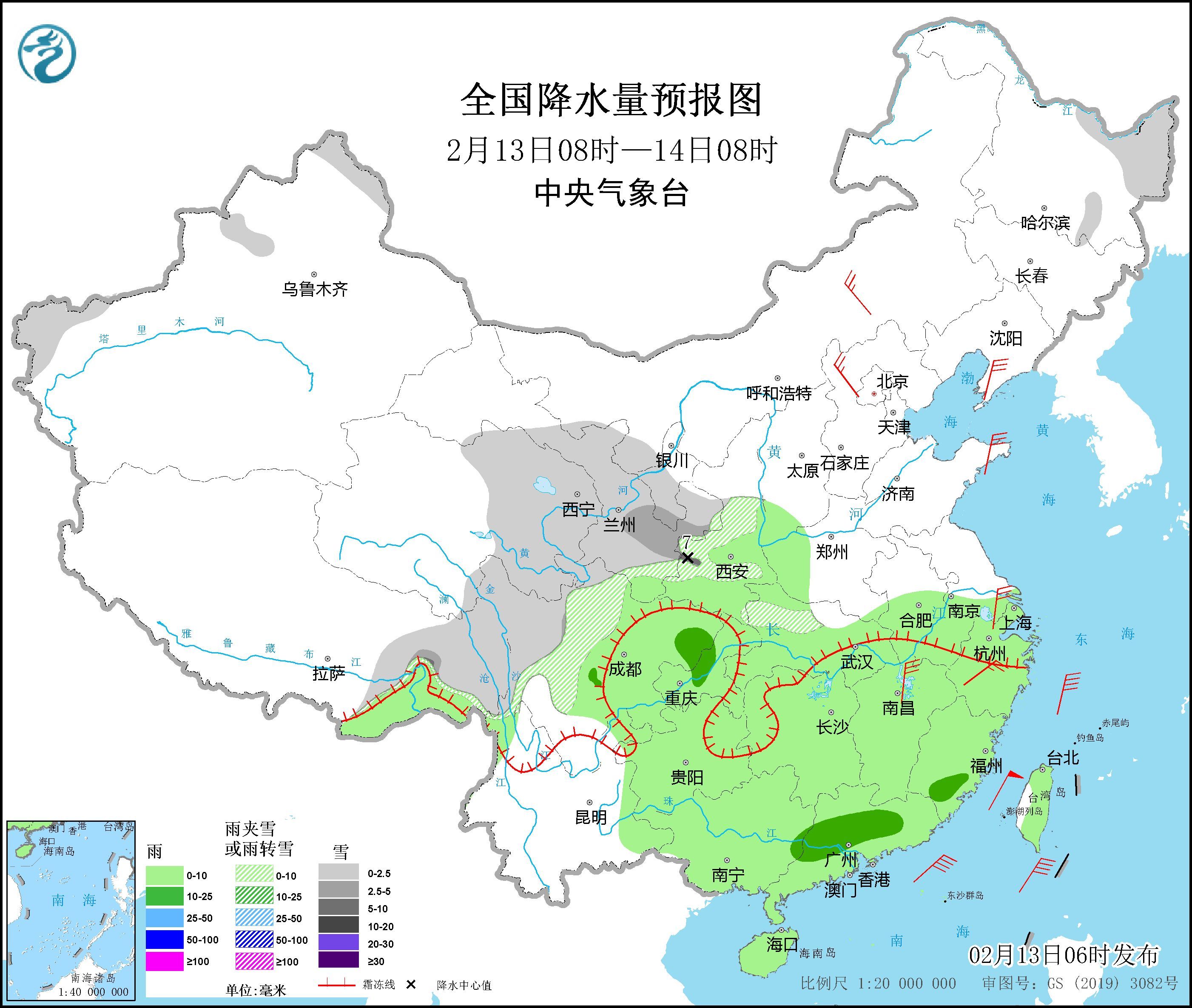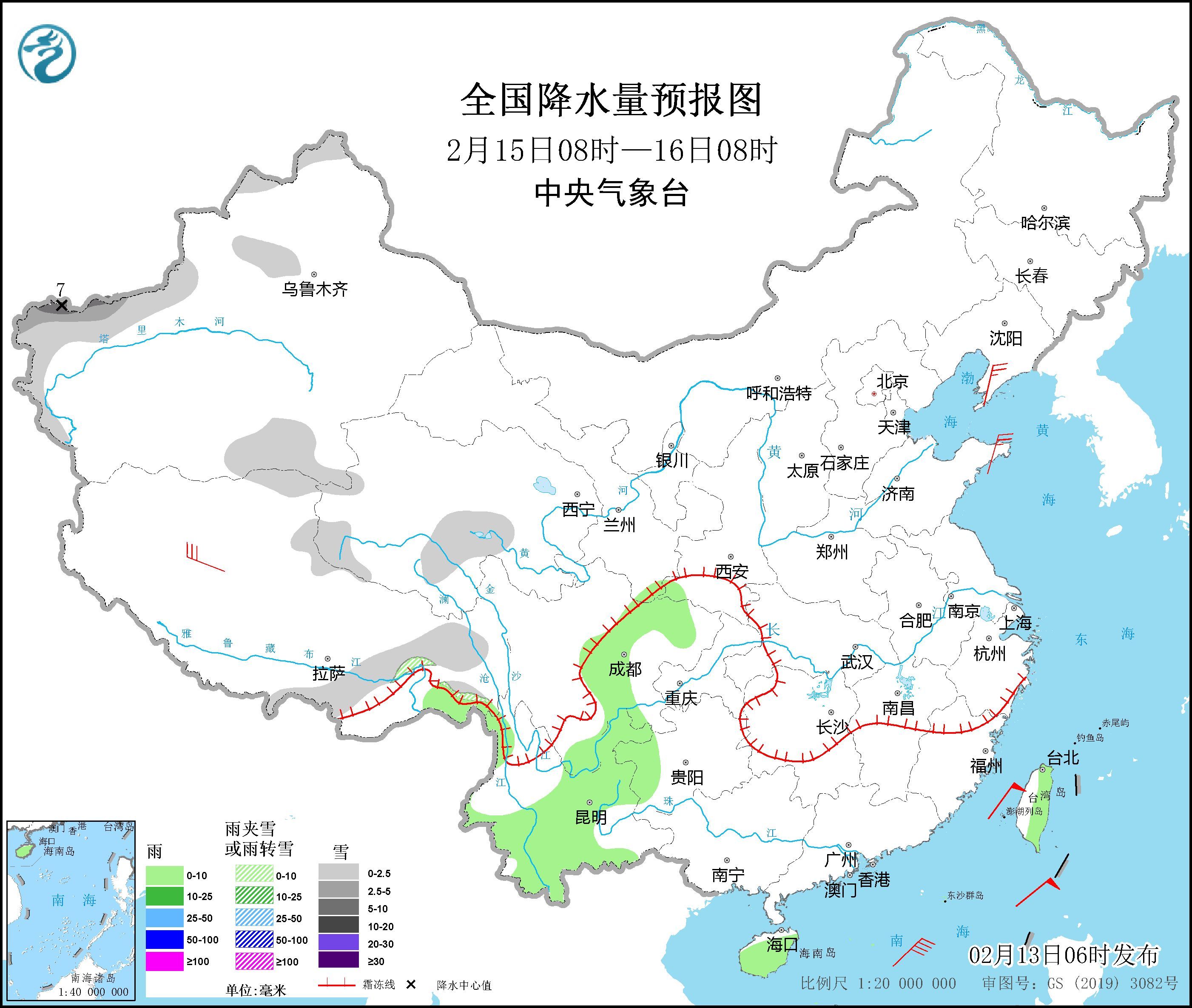 2月13日08时至14日08时,黑龙江东北部、西藏东部、西北地区中东部、川西高原等地部分地区有小到中雪或雨夹雪,其中,西藏东南部、甘肃东南部、陕西秦岭西部等地局地有大雪(5~7毫米);西北地区东南部、江淮大部、江汉大部、江南、西南地区东部、华南、台湾岛大部等地部分地区有小雨,部分地区中雨。内蒙古中东部、辽东半岛、河北北部、山东半岛、江南东部、华南沿海地区等地部分地区有4~6级风,西藏等地部分地区有6~7级风。